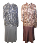 Костюм ритуальный женский с юбкой выполнен в сдержанных цветах: сером и коричневом. Юбка однотонная, расклешенного фасона и длиной ниже колен. Удлиненная блуза с воротником-стойкой и длинным рукавом декорирована бантом.